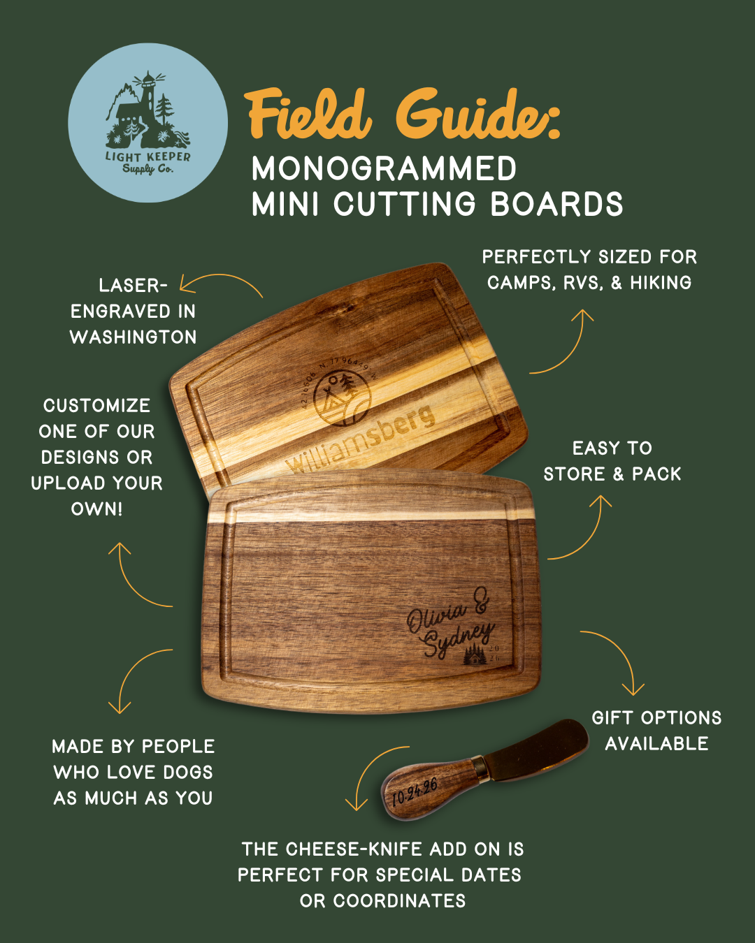 The Cheese Knife Add-On: Pair your board with a matching acacia wood cheese knife engraved with a special date, coordinates, or name. Because every great adventure deserves a great charcuterie moment 🧀